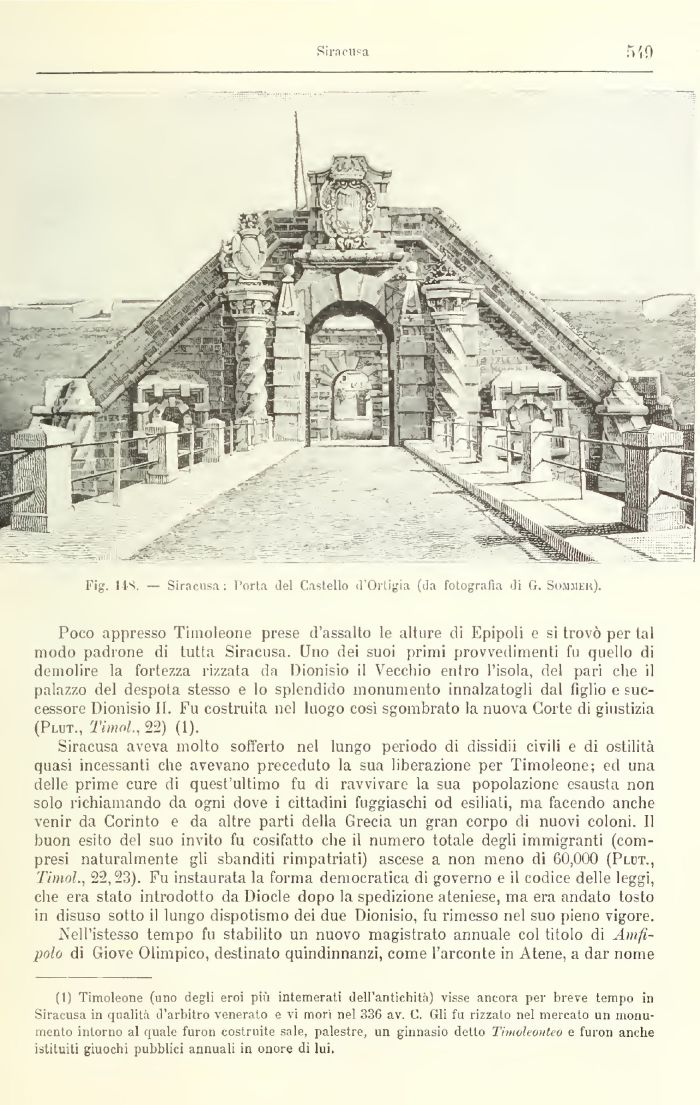 Poco appresso Tiinoleone prese d'assalto le alture di Epipoli e si trovò per tal modo padrone di tutta Siracusa. Uno dei suoi primi provvedimenti fu quelle! di demolire la fortezza rizzata da Dionisio il Vecchio entro l'isola, del pari che il palazzo del despota stesso e lo splendido monumento innalzatogli dal figlio e successore Dionisio II. Fu costruita nel luogo così sgombrato la nuova Corte di giustizia (Plut., Timol., 22) (1).