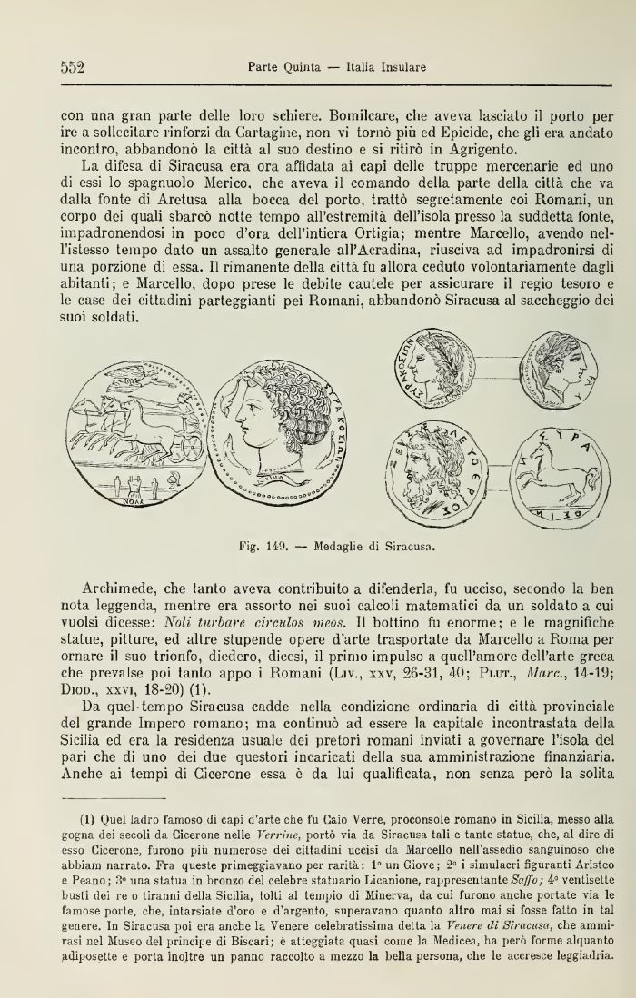 Archimede, che tanto aveva contribuito a difenderla, fu ucciso, secondo la ben nota leggenda, mentre era assorto nei suoi calcoli matematici da un soldato a cui vuoisi dicesse: Noli turbare circulos meos. Il bottino fu enorme; e le magnifiche statue, pitture, ed altre stupende opere d'arte trasportate da Marcello a Roma per ornare il suo trionfo, diedero, dicesi, il primo impulso a quell'amore dell'arte greca che prevalse poi tanto appo i Romani (Liv., xxv, 26-31, 40; Plut., Marc., 14-19; diod., xxvi, 18-20) (1).