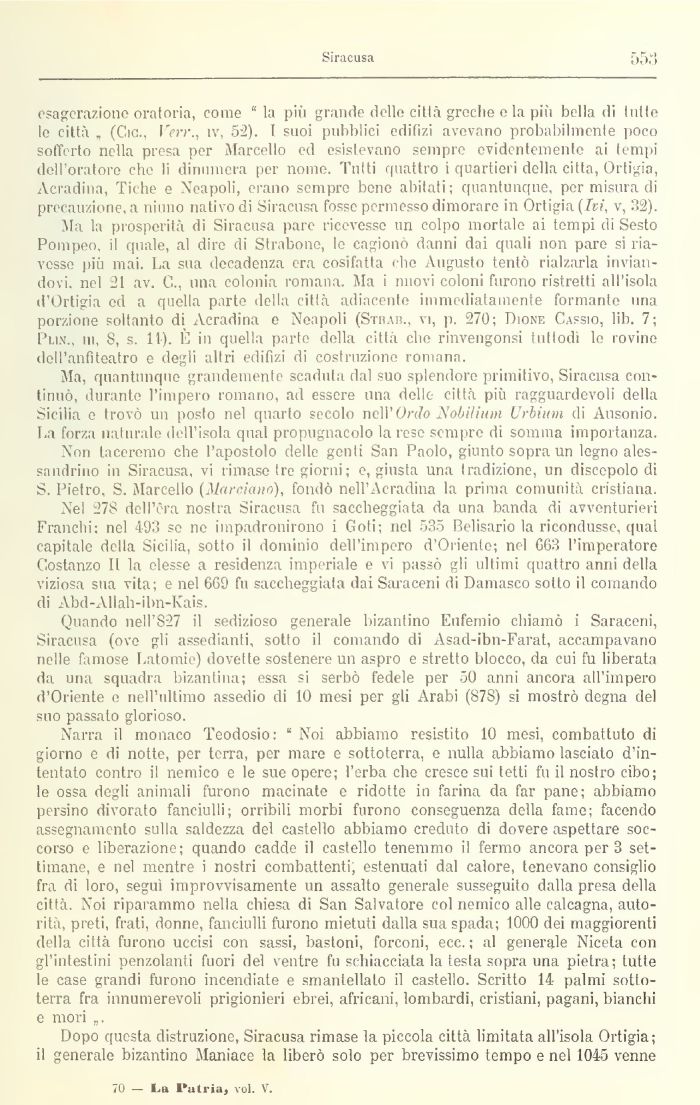 Nel 27S dell'ora nostra Siracusa fu saccheggiata da una banda di avventurieri Franchi: nel 493 so ne impadronirono i Goti; nel 535 Belisario la ricondusse, qual capitale della Sicilia, sotto il dominio dell'impero d'Oriente; nel 663 l'imperatore Costanzo II la elesse a residenza imperiale e vi passò gli ultimi quattro anni della viziosa sua vita; e nel 669 fu saccheggiala dai Saraceni di Damasco sotto il comando di Abd-Aliah-ibn-Kais.