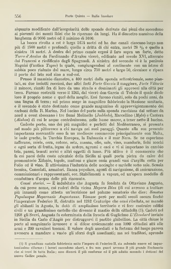 Cernii storici. — È indubitato che Augusta fu fondata da Ottaviano Augusto, da cui prese nome, coi ruderi della vicina Megara Iblea (di cui avremo a trattare più innanzi) come attesta un'iscrizione nel palazzo senatorio che dice: Senatus Popidusque Megarensis Augustamis. Rimase però per molti secoli oscura finché l'imperatore Federico II, distrutta nel 1242 Centuripe che erasi ribellata, ne mandò gli abitanti in Agosta, la dotò di amplissimo territorio e vi fece costruire edilìzi civili e un grandissimo castello che divenne il mastio della cittadella (1). Caduti nel 1268 gli Svevi, Augusta fu eslerniinata dalla ferocia di Guglielmo L'Ftendard inviato in Sicilia da Carlo d'Angiò per distruggervi il partito ghibellino. La città chiuse le porte al sanguinario invasore e si difese eroicamente con 1000 cittadini atti alle armi e 200 cavalieri toscani. Il valore degli assediati e la fortezza del luogo pareva avessero a mandare a vuoto gli sforzi degli assedianti; ma sei traditori, aprendo
