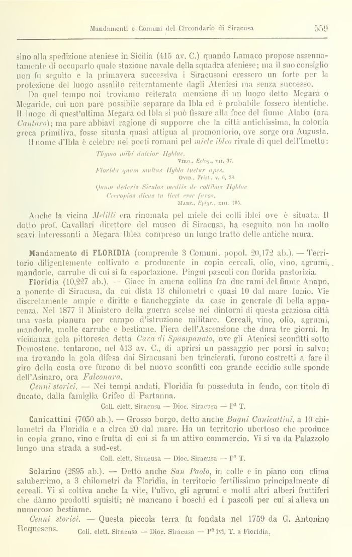 Floridia (10,227 ab.). — Giace in amena collina fra due rami del fiume Anapo, a ponente di Siracusa, da cui dista 13 chilometri e quasi 10 dal mare Ionio. Vie discretamente ampie e diritte e fiancheggiate da case in generale di bella apparenza. Nel 1877 il Ministero della guerra scelse nei dintorni di questa graziosa città una vasta pianura per campo d'istruzione militare. Cereali, \ino, olio, agrumi, mandorle, molle carrube e bestiame. Fiera dell'Ascensione che dura tre giorni. In vicinanza gola pittoresca detta Cava di Spampanato, ove gli Ateniesi sconfìtti sotto Demostene, tentarono, nel 413 av. C., di aprirsi un passaggio per porsi in salvo; ma trovando la gola difesa dai Siracusani ben trincierati, furono costretti a fare il giro della costa ove furono di bel nuovo sconfitti con grande eccidio sulle sponde dell'Asinara, ora Falconara.