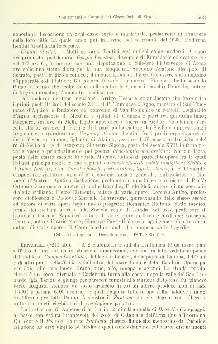 Carlentiui (7210 ab.). — A 2 chilometri a sud da Lentini e a 10 del mare Ionio sull'alto di una collina in situazione amenissima, con da un lato veduta stupenda del suddetto Campus Leontinus, del lago di Lentini, della piana di Catania, dell'Etna e di altri punii della Sicilia e, dall'altro, del mare Ionio e delle Calabrie. Opera pia per dote alle maritande. Grano, vino, olio, canapa e agrumi. La strada ferrata, che si è un poco internata a Carlentiui, torna alla eosta lungo la valle del San Leonardo (già Terio), e giunge per parecchi tunnels alla stazione d'Agnone. Sul pianoro verso Augusta stendesi un vasto aranceto in cui un albero produce non di rado 3-1000 e persino 6000 arancie, le quali colgonsi tutte in una volta, laddove i limoni fruttificano per tutto l'anno. A sinistra il Pantano, grande stagno, con alberelli, fra!te e canneti, ricchissimi di cacciagione palustre.