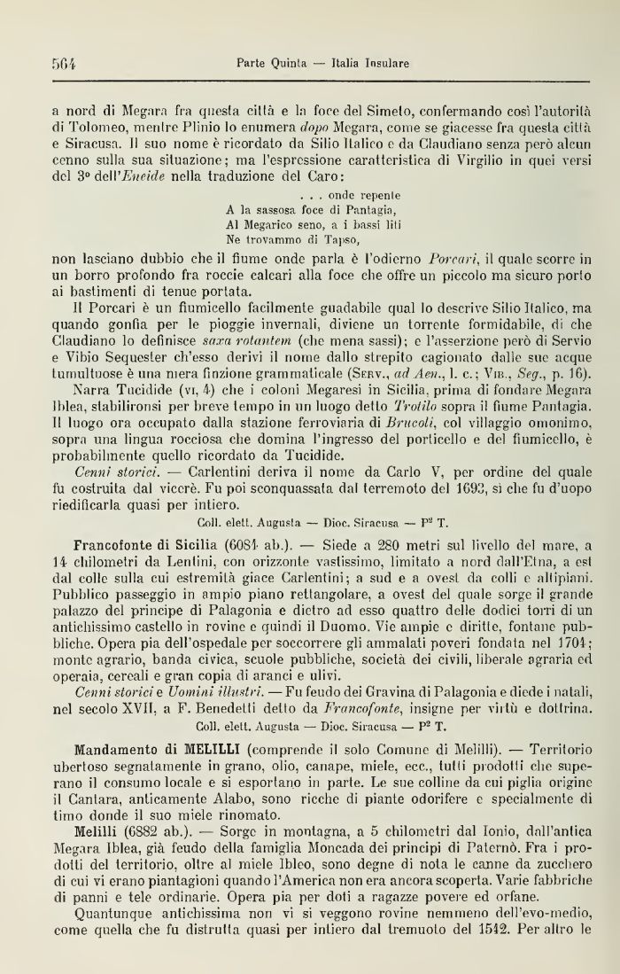 Melilli (C882 ab.). — Sorge in montagna, a 5 chilometri dal Ionio, dall'aulica Megara Iblea, già feudo della famiglia Moncada dei principi di Paterno. Fra i prodotti del territorio, olire al miele Ibleo, sono degne di nota le canne da zucchero di cui vi erano piantagioni quando l'America non era ancora scoperta. Varie fabbriche di panni e tele ordinarie. Opera pia per doti a ragazze povere ed orfane.