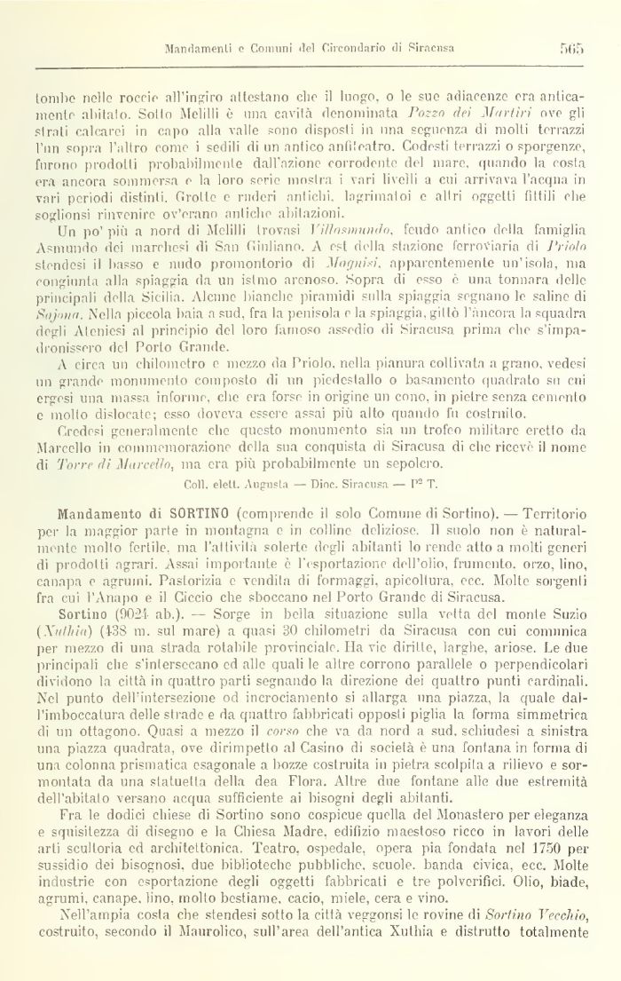 Mandamento di SORTINO (comprende il solo Comune di Sortirlo). — Territorio poi la maggior parte in montagna e in colline deliziose. Il suolo non è naturalmente mollo fertile, ma l'atlivila solerte degli abitanti lo rende atto a molti generi di prodotti agrari. Assai importante è l'esportazione dell'olio, frumento, orzo, lino, canapa e agrumi. Pastorizia e vendila di formaggi, apicoltura, ecc. Molte sorgenli fra cui l'Anapo e il Ciccio che sboccano nel Porto Grande di Siracusa.