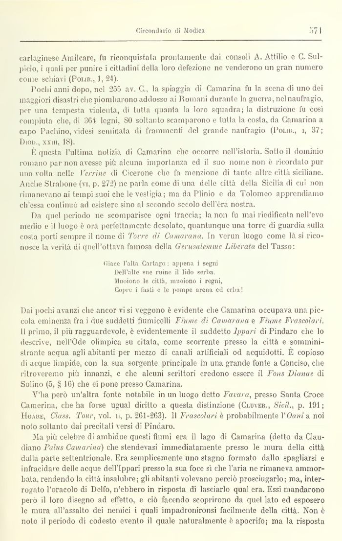 V'ha però un'altra fonte notabile in un luogo detto Favara, presso Santa Croce Cam e ri na, che ha forse ugual diritto a questa distinzione (Ci/u\er., SieiL, p. 191; HoAbe, Class. Tour, voi. n, p. 261-263). 11 Frascolari è probabilmente VOania noi noto soltanto dai precitati versi di Pindaro.