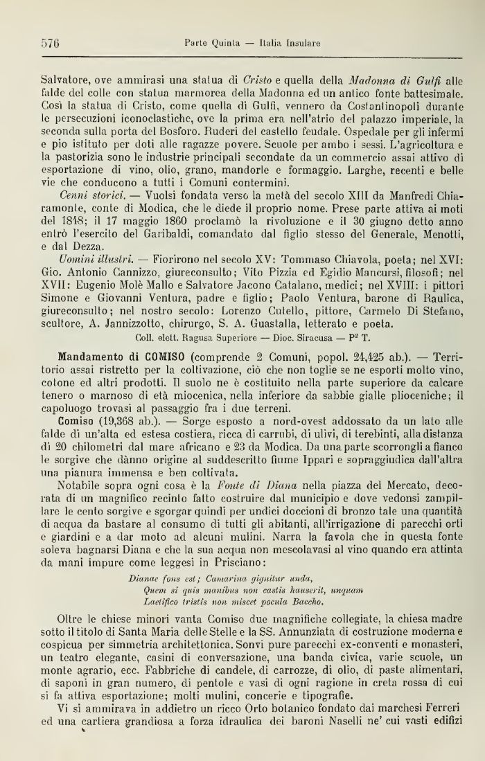Coiniso (19,368 ab.). — Sorge esposto a nord-ovest addossato da un lato alle falde di un'alta ed estesa costiera, ricca di carrubi, di ulivi, di terebinti, alla distanza di 20 chilometri dal mare africano e 23 da Modica. Da una parte scorrongli a fianco le sorgive che dànno origine al suddescritlo fiume Ippari e sopraggiudica dall'altra una pianura immensa e ben coltivata.