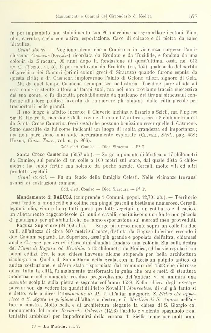 11 suo luogo è affatto incerto; il Oliverio inchina a fissarlo a Scicli, ma l'inglese Sir R. Hoare fa menzione delle rovine di una città antica a circa 3 chilometri a est da Santa Croce Cani eri ri a (vedi sotto) che possono benissimo esser quelle di Casmene. Sono descritte da lui come indicanti un luogo di molta grandezza ed importanza; ina non pare sieno mai state accuratamente esplorate (Cluver., SiciL, pag. 458; IIoaiìk, Class. Tour., voi. n, p. 266).