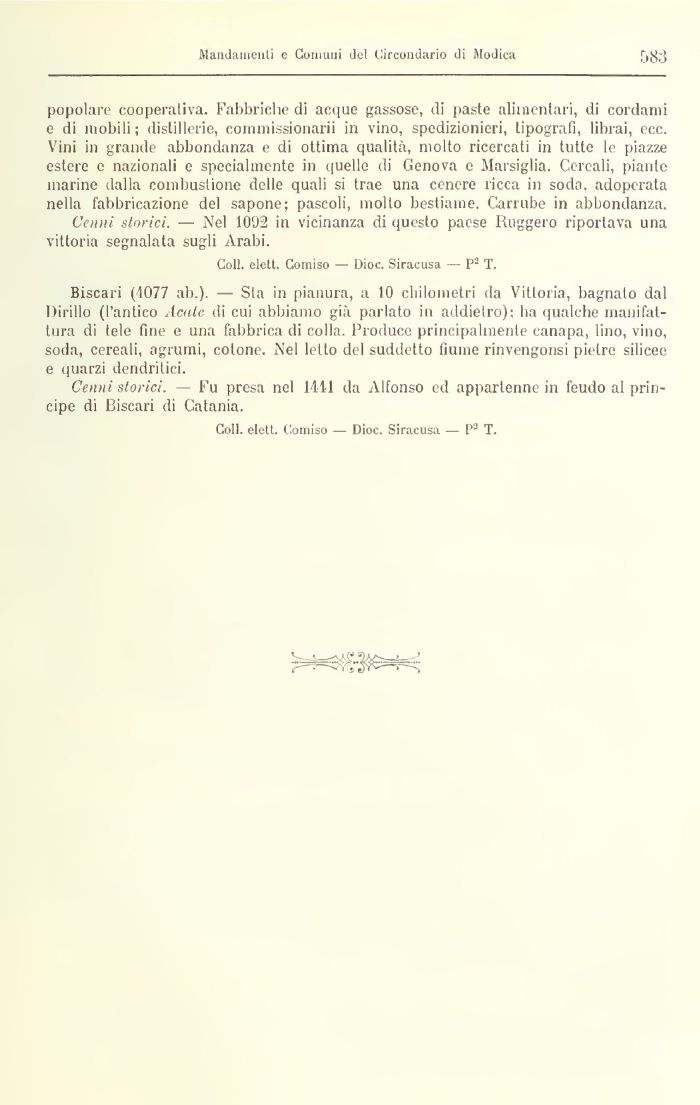 Biscari (1077 ab.). — Sta in pianura, a 10 chilometri da Vittoria, bagnato dal Dirillo (l'antico Acute di cui abbiamo già parlato in addietro); ha qualche manifattura di tele fine e una fabbrica di colla. Produce principalmente canapa, lino, vino, soda, cereali, agrumi, cotone. Nel letto del suddetto fiume rinvengami pietre silicee e quarzi dendritici.