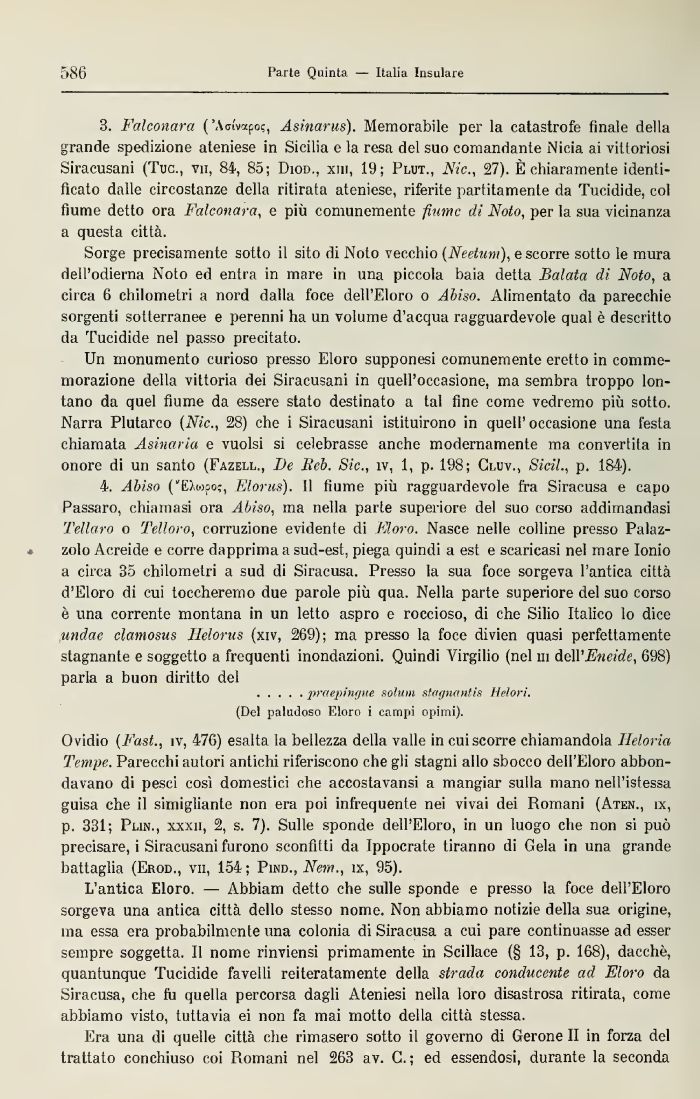 * zolo Acreide e corre dapprima a sud-est, piega quindi a est e scaricasi nel mare Ionio a circa 35 chilometri a sud di Siracusa. Presso la sua foce sorgeva l'antica città d'Eloro di cui toccheremo due parole più qua. Nella parte superiore del suo corso è una corrente montana in un letto aspro e roccioso, di che Silio Italico lo dice Mudai clamosus IMorus (xiv, 269); ma presso la foce divien quasi perfettamente stagnante e soggetto a frequenti inondazioni Quindi Virgilio (nel in dell'Eneide, 698) parla a buon diritto del