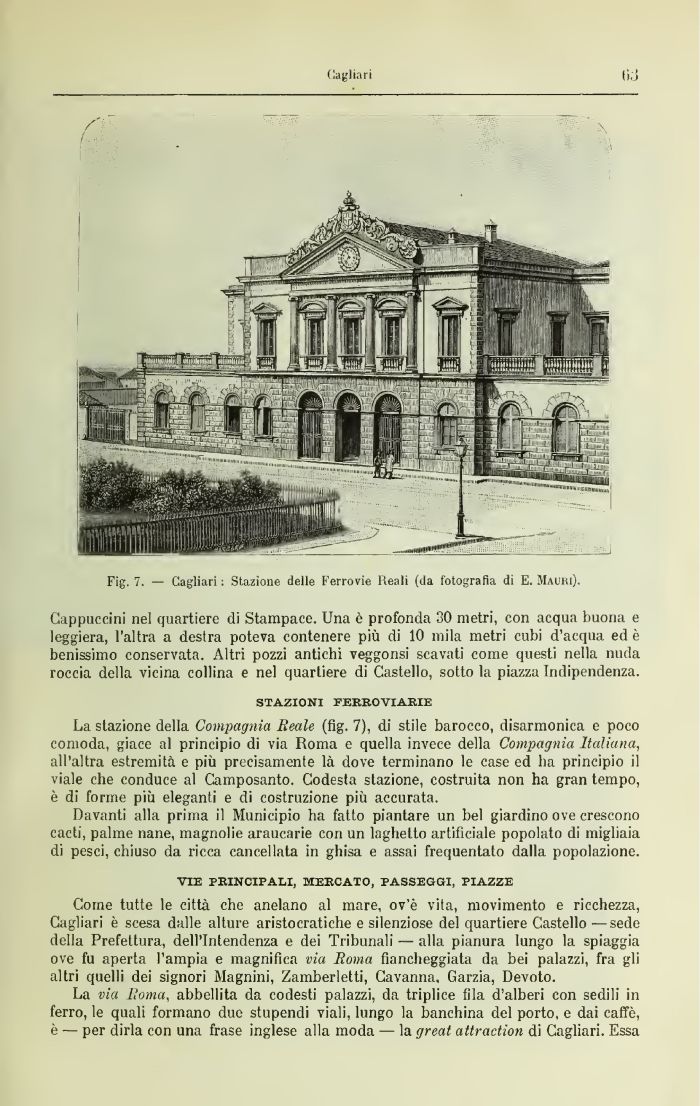 Come tutte le città che anelano al mare, ov'è vita, movimento e ricchezza, Cagliari è scesa dalle alture aristocratiche e silenziose del quartiere Castello —sede della Prefettura, dell'Intendenza e dei Tribunali — alla pianura lungo la spiaggia ove fu aperta l'ampia e magnifica via Roma fiancheggiata da bei palazzi, fra gli altri quelli dei signori Magnini, Zamberletti, Cavatina, Garzia, Devoto.