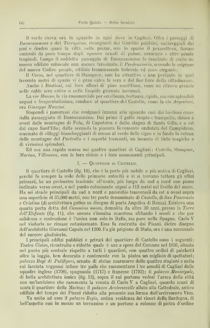 Il verde ricrea ora lo sguardo in ogni dove in Cagliari. Olire i passeggi di Bumcmunino e del Terrapieno, ricongiunti dai Giardini pubblici, ombreggiali dai pini e dentro quasi la fìtta, nelle piazze, ove lo sdazio il permetteva, furono costruiti da poco tempo degli tir/u/trài. ornati di inalino, araucarie e altre piante tropicali. Lungo il suddetto passeggio di Buofliantrniiio fu innalzato di corto un nuovo edilizio colossale non ancora terminato, il Penitenziario, secondo le esigenze del nuovo Codice penale, edilizio tecnicamente lodevole ed anco elegante.