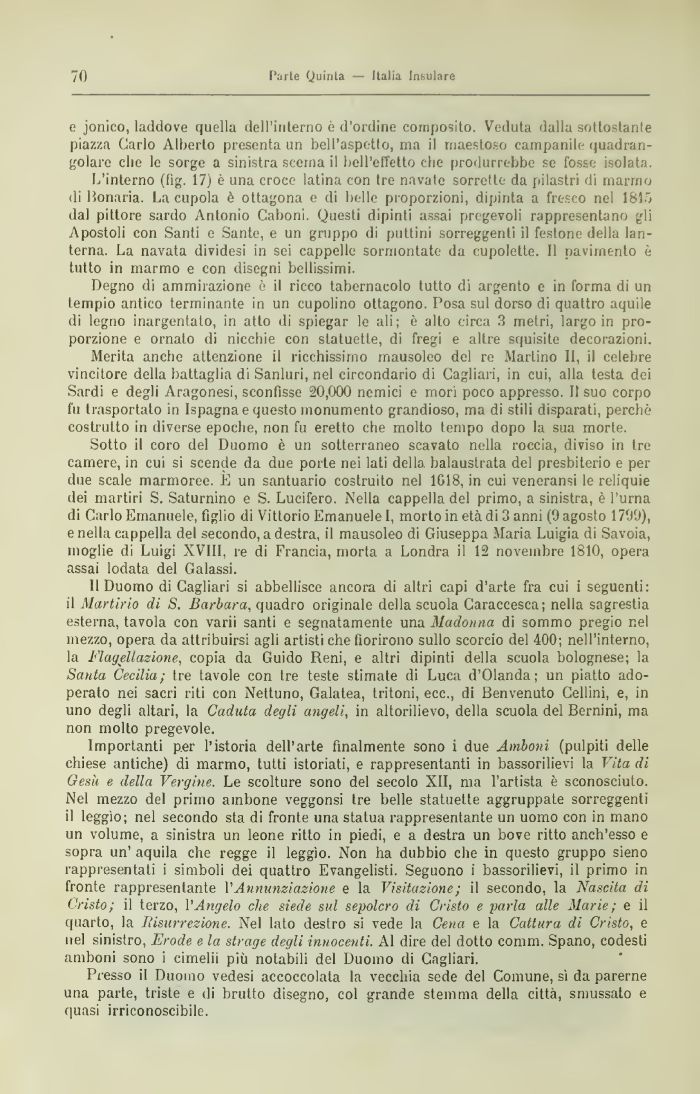 L'interno (fig. 17) è una croce latina con tre navate sorrette da pilastri di marmo di Bonaria. La cupola è ottagona e di belle proporzioni, dipinta a fresco nel 1815 dal pittore sardo Antonio Caboni, Questi dipìnti assai pregevoli rappresentano gli Apostoli con Santi e Sante, e un gruppo di puttini sorreggenti il festone della lanterna. La navata dividesi in sei cappelle sormontate da cupolette. Il pavimento è tutto in marmo e con disegni bellissimi.