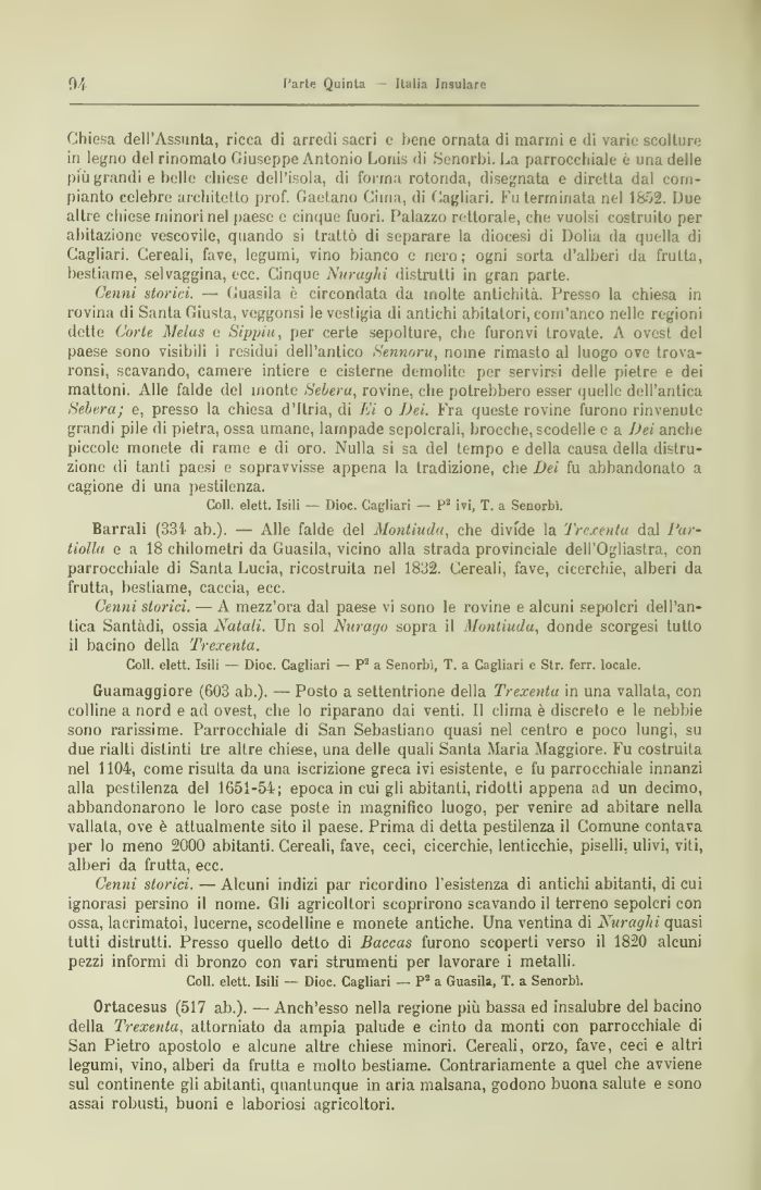 Guamagtjiore (603 ab.). — Posto a settentrione della Trexenta in una vallata, con colline a nord e ad ovest, che lo riparano dai venti II clima è discreto e le nebbie sono rarissime. Parrocchiale dì San Sebastiano quasi nel centro e poco lungi, su due rialti distinti tre altre chiese, una delle quali Santa Maria Maggiore. Fu costruita nel 1104, come risulta da una iscrizione greca ivi esistente, e fu parrocchiale innanzi alla pestilenza del 1651-54; epoca in cui gli abitanti, ridotti appena ad un decimo, abbandonarono le loro case poste in magnifico luogo, per venire ad abitare nella vallata, ove è attualmente sito il paese. Prima di detta pestilenza il Comune contava per lo meno 2000 abitanti. Cereali, fave, ceci, cicerchie, lenticchie, piselli, ulivi, viti, alberi da frutta, ecc.