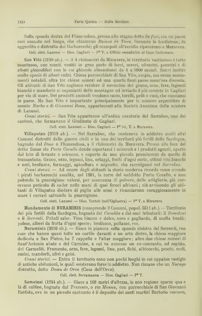 Villaputzu (2G59 ab.). — Nel Sarrabus, che conteneva in addietro molli altri Comuni distrutti dalle guerre civili e in uno dei territorii più fertili della Sardegna, bagnato dal Dosa o Flumendosa, a 3 chilometri da Muravera. Presso alla foce del detto fiume sta Porto Corallo donde esportansi i minerali e i prodotti agrari!, aperto dal iato di levante e scirocco, e coperto da una piccola prominenza da quello di tramontana. Grano, orzo, legumi, lino, ortaggi, frutti d'ogni sorta, ottimi vini bianchi e neri, bestiame, formaggi, apicoltura e mignatte, che raccolgonsi nel Sarrabus.