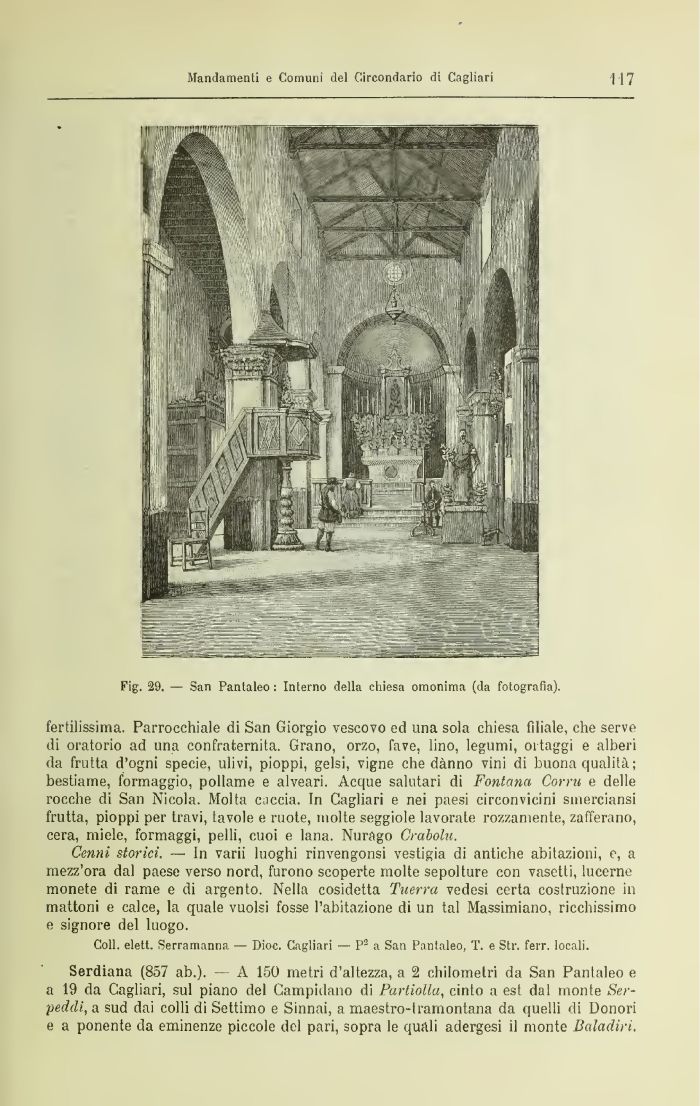 fertilissima. Parrocchiale di San Giorgio vescovo ed una sola chiesa filiale, che serve di oratorio ad una confraternita. Grano, orzo, fave, lino, legumi, ortaggi e alberi da frutta d'ogni specie, ulivi, pioppi, gelsi, vigne che dànno vini di buona qualità ; bestiame, formaggio, pollame e alveari. Acque salutari di Fontana Corni e delle rocche di San Nicola. Molta caccia. In Cagliari e nei paesi circonvicini smerciansi frutta, pioppi per travi, tavole e ruote, molte seggiole lavorate rozzamente, zafferano, cera, miele, formaggi, pelli, cuoi e lana. Nurago Crabolu.