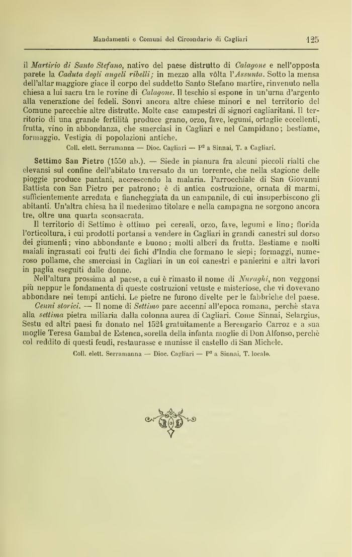 il Martirio di Santo Stefano, nativo del paese distrutto di Calagone e nell'opposta parete la Caduta degli angeli ribelli; in mezzo alla vòlta VAssunta. Sotto la mensa dell'aitar maggiore giace il corpo del suddetto Santo Stefano martire, rinvenuto nella chiesa a lui sacra tra le rovine di Calagone. Il teschio si espone in un'urna d'argento alla venerazione dei fedeli. Sonvi ancora altre chiese minori e nel territorio del Comune parecchie altre distrutte. Molte case campestri di signori cagliaritani. Il territorio di una grande fertilità produce grano, orzo, fave, legumi, ortaglie eccellenti, frutta, vino in abbondanza, ebe smerciasi in Cagliari e nel Campidano; bestiame, formaggio. Vestigia di popolazioni antiche.