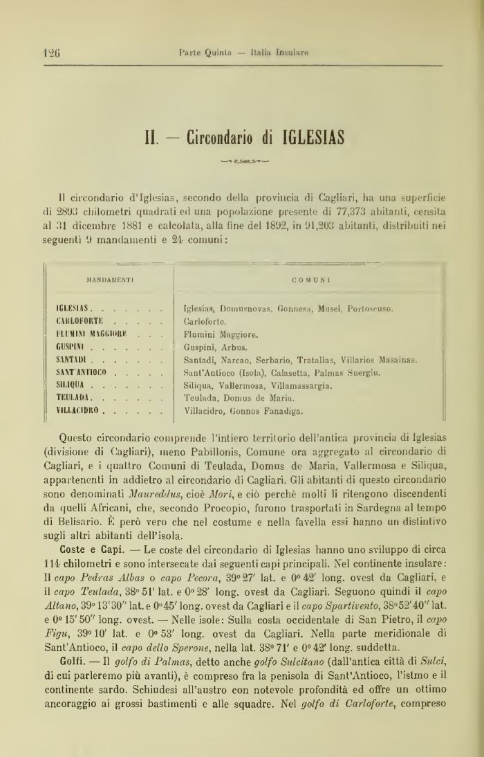 Coste e Capi. — Le coste del circondario di Iglesias hanno uno sviluppo di circa 114 chilometri e sono intersecate dai seguenti capi principali. Nel continente insulare: Il capo Pedras Albas o capo Pecora, 39° 27' lat. e 0° 42' long, ovest da Cagliari, e il capo Teulada, 38 51' lat. e 0°28' long, ovest da Cagliari. Seguono quindi il capo Aitano, 39 13'30 lat. e 045' long, ovest da Cagliari e il capo Spartivento, 38*52'40'' lat. e 0° 15'50'' long, ovest. — Nelle isole: Sulla costa occidentale di San Pietro, il capo Figu, 39° 10' lat. e 0° 53' long, ovest da Cagliari. Nella parte meridionale di Sant'Antioco, il capo dello Sperone, nella lat. 38° 71' e 0°42' long, suddetta.