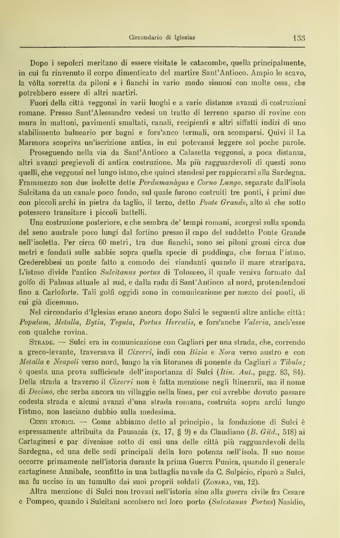 Strade. — Sulci era in comunicazione con Cagliari per una strada, che, correndo a greco-levante, traversava il Gixerri, indi con Bizio e Nora verso austro e con Meta-Ila e Neapoli verso nord, lungo la via litoranea di ponente da Cagliari a Tìhula; è questa una prova sufficiente dell'importanza dì Sulci (Ititi. Aut., pagg. 83, 84). Della strada a traverso il Cixerri non è fatta menzione negli Itinerarii, ma il nome di Decimo, che serba ancora un villaggio nella linea, per cui avrebbe dovuto passare codesta strada e alcuni avanzi d'una strada romana, costruita sopra archi lungo l'istmo, non lasciano dubbio sulla medesima.