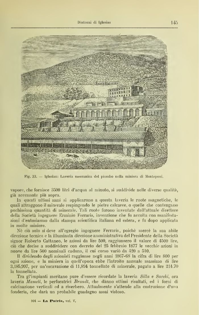 In questi ultimi anni si applicarono a questa laveria le ruote magnetiche, le quali attraggono il minerale respingendo le pietre calcaree, o quelle che contengono pochissima quantità dì minerale. Tali ruote furono inventate dall'attuale direttore della Società ingegnere Erminio Ferraris, invenzione che fu accolla con manifestazioni d'entusiasmo dalla stampa scientifica italiana ed estera, e fu dopo applicata in molte miniere.