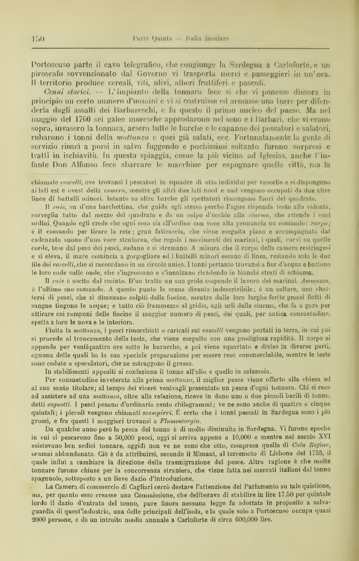 Da qualche anno però la pesca del tonno è di molto diminuita in Sardegna. Vi furono epoche in cui si pescarono fino a 50,000 pesci, oggi si arriva appena a 10,000 e mentre nel secolo X\ ì esistevano ben sedici tonnare, oggidì non ve ne sono che otto, compresa quella di Cala Regina, oramai abbandonata. Ciò è da attribuirsi, secondo iì Mimaut, al terremoto di Lisbona del 1755, il quale influì a cambiare la direzione della trasmigrazione del pesce. Altra ragione è che molte tonnare furono chiuse per la concorrenza straniera, che viene fatta nei mercati italian, dal tonno spagnuolo, sottoposto a un lieve dazio d'introduzione.