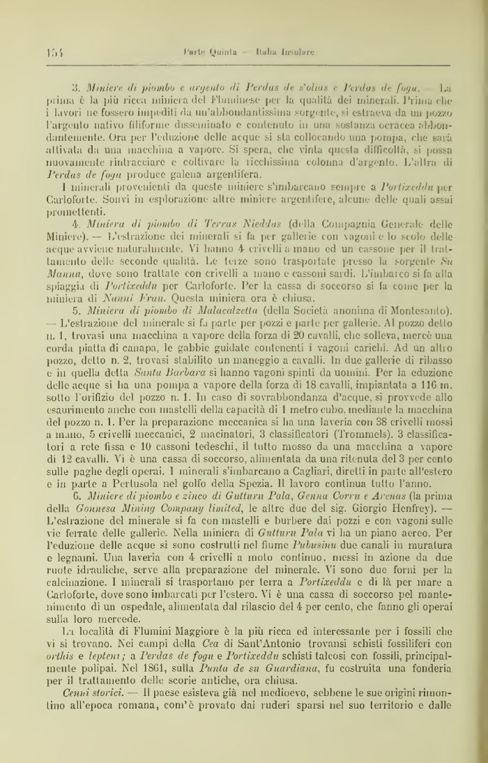 G. Miniere di piombo e zinco di Gutluru Pala, Genna Corni e Arenai; (la prima della Gonnesa Mining Company Umited, le altre due del sig. Giorgio Henfrey). — L'estrazione del minerale si fa con mastelli e burbere dai pozzi e con vagoni sulle vie ferrate delle gallerie. Nella miniera di Girl Inni Pala vi ha un piano aereo. Per l'eduzione delle acque si sono costrutti nel fiume Pubitsinu due canali in muratura e legnami. Una laveria con 4 crivelli a moto continuo, mess; in azione da due ruote idrauliche, serve alla preparazione del minerale. Vi sono due forni per la calcinazione. I minerali si trasportano per terra a Poriixeddu e di là per mare a Garloforle, dove sono imbarcali per l'estero. Vi è una cassa di soccorso pel mantenimento di un ospedale, alimentata dal rilascio del 4 per cento, che fanno gli operai sulla loro mercede.