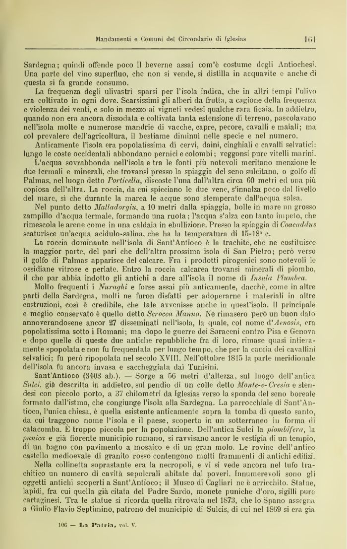 Sant'Antioco (3403 ab.). — Sorge a 5G metri d'altezza, sul luogo dell'antica Sulci. già descritta in addietro, sul pendio di un colle detto Monte-e- Cresia e sten-desi con piccolo porto, a 37 chilometri da Iglesias verso la sponda del seno boreale formato dall'istmo, che congiunge l'isola alla Sardegna. La parrocchiale di Sant'Antioco, l'unica chiesa, è quella esistente anticamente sopra la tomba di questo santo, da cui traggono nome l'isola e il paese, scoperta in un sotterraneo in forma di catacomba. E troppo piccola per la popolazione. Dell'antica Sulci la piombifera, la punica e già fiorente municipio romano, si ravvisano ancor le vestigia dì un tempio, dì un bagno con pavimento a mosaico e di un gran molo. Le rovine dell'antico castello medioevale di granito rosso contengono molti frammenti di antichi edilizi