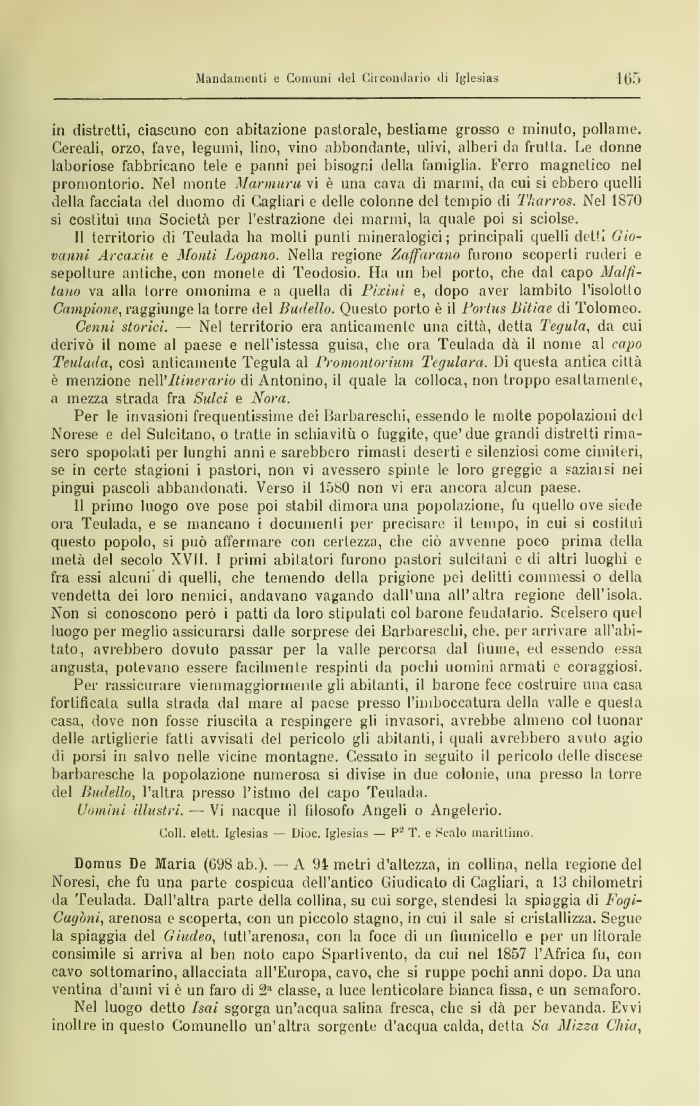Domus De Maria (098 ab.). — A 94 metri d'altezza, m collina, nella regione del Noresi, che fu una parte cospicua dell'antico Giudicato di Cagliari, a 13 chilometri da Teulada. Dall'altra parte della collina, su cui sorge, stendesì la spiaggia di Fogi-Cagòni, arenosa e scoperta, con un piccolo stagno, in cui ti sale si cristallizza. Segue la spiaggia del Giudeo, tutt'arenosa, con la foce di un lìumicello e per un litorale consimile si arriva al ben noto capo Sparli vento, da cui nel 1857 l'Africa fu, con cavo sottomarino, allacciata all'Europa, cavo, che si ruppe pochi anni dopo. Da una ventina d'anni vi è un faro di 2a classe, a luce lenticolare bianca fissa, e un semaforo.