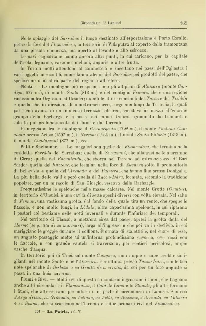 Fiumi e Rivi. — Molti rivi di questo circondario ingrossano i fiumi, che bagnano anche altri circondar! il Flumendosa, il Cala de Luna e lo Stanali; gli altri formano i fiumi, che attraversano per intiero o in parte il circondario di Lanusei. Son essi s'Acquafrisca, su Grommai, su Pellano, su Pelai, su Buzzone, s'Arenada, su Palmera e su Sisina, che si scaricano nel Tirreno e i due primari! rivi del Flumendosa.