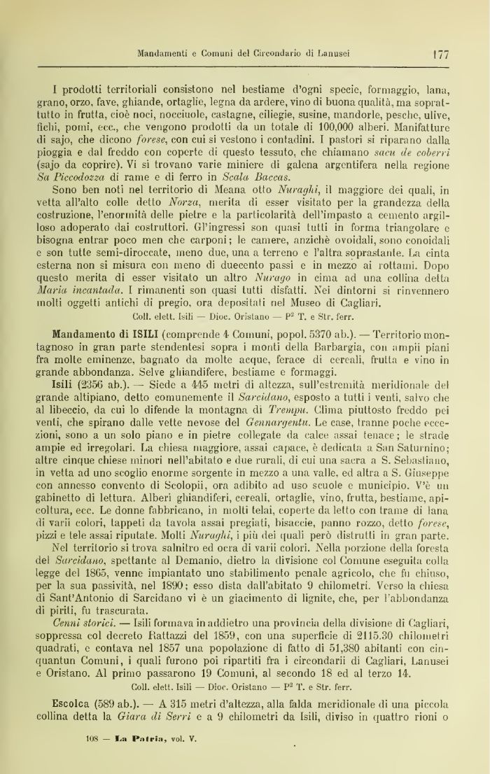Isili (2356 ab.). — Siede a 445 metri di altezza, sull'estremità meridionale del grande altipiano, detto comunemente il Sarcidauo, esposto a tutti i venti, salvo che al libeccio, da cui lo difende la montagna di Trempu. Clima piuttosto freddo pei venti, che spirano dalle vette nevose del Gennargentu. Le case, tranne poche eccezioni, sono a un solo piano e in pietre collegate da calce assai tenace ; le strade ampie ed irregolari. La chiesa maggiore, assai capace, è dedicata a San Satui nino; altre cinque chiese minori nell'abitato e due rurali, di cui una sacra a S. Sebastiano, m vetta ad uno scoglio enorme sorgente in mezzo a una valle, ed altra a S. Giuseppe con annesso convento di Scolopii, ora adibito ad uso scuole e municipio. V'è un gabinetto di lettura. Àlberi ghiandiferi, cereali, ortaglie, vino, frutta, bestiame, apicoltura, ecc. Le donne fabbricano, in molti telai, coperte da letto con trame di lana di varii colori, tappeti da tavola assai pregiati, bisaccie, panno rozzo, detto forese, pizzi e tele assai riputate. Molti Nuraghi, i più dei quali però distrutti in gran parte.