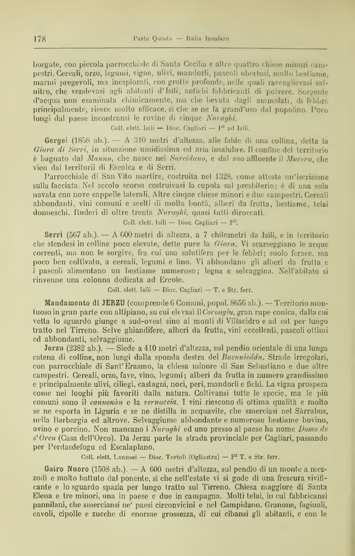 Gergei (1858 alt.). — A 310 metri d'altezza, alle falde di una collina, delta la Giura di Serri, in situazione umidissima ed aria insalubre. Il confine del territorio è bagnalo dal illanuu, che nasce nel Surcidano, e dal suo affluente il Murerà, che vien dai lerritorii di Escolca e di Serri