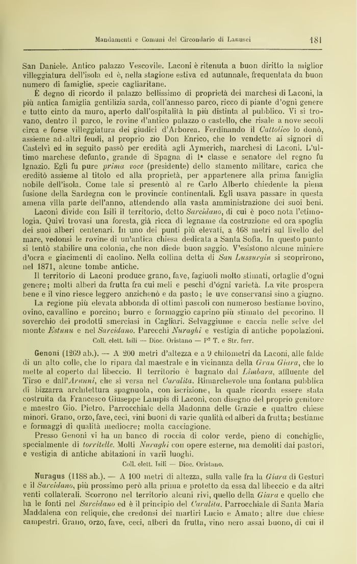 Genoni (1169 ab.). — A 200 metri d'altezza e a 9 chilometri da Laconi, alle falde di un alto colle, che lo ripara dal maestrale e in vicinanza della Gran Giara, che lo mette al coperto dal libeccio. 11 territorio è bagnato dal Limhara, affluente del Tirso e dall'Arimni, che si versa nel Caralita. Rimarchevole una fontana pubblica di bizzarra architettura spagnuola, con iscrizione, la quale ricorda essere stata costruita da Francesco Giuseppe LampiS di Laconi, con disegno del proprio genitore e maestro Gio. Pietro. Parrocchiale della Madonna delle Grazie e quattro chiese minori. Grano, orzo, fave, ceci, vini buoni di varie qualità ed alberi da frutta; bestiame e formaggi di qualità mediocre; molta cacciagione.