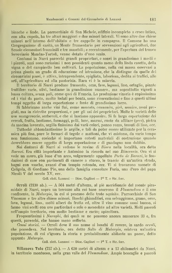 Orroli (2130 ab.). — A 564 metri d'altezza, al piò meridionale del monte piramidale di Nurri, sopra un terrazzo alla cui base scorrono il Flumendosa e il suo confluente, la Mulargia, in cui si pescano delle trote squisite. Parrocchiale di San Vincenzo e tre altre chiese minori. Boschi ghiandiferi, con selvaggiuine, grano, orzo, fave, legumi, lino, molli alberi da frutta ed, oltre il vino comune assai buono, si fanno vini scelti con uve particolari o sole o mescolate ad altre varietà. Molti pascoli nell'ampio territorio, con molto bestiame e cacio; apicoltura.