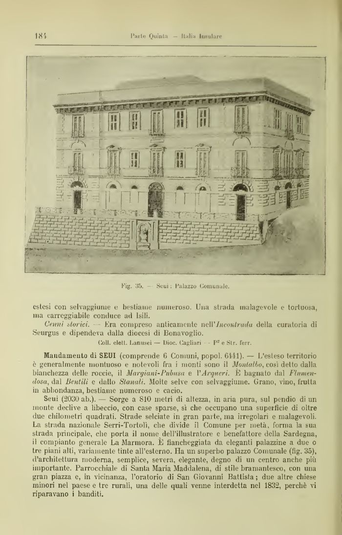 Seui (2030 ab.). — Sorge a 810 metri di altezza, in aria pura, sul pendio di un monte declive a libeccio, con case sparse, sì che occupano una superfìcie di oltre due chilometri quadrati. Strade selciate in gran pai te, ma irregolari e malagevoli. La strada nazionale Serri-Tortolì, che divide il Comune per metà, forma la sua strada principale, che porta il nouie_ dell'illustratore e benefattore della Sardegna, il compianto generale La Marniora. E fiancheggiata da eleganti palazzine a due o tre piani alti, variamente tinte all'esterno. Ha un superbo palazzo Comunale (fig. 35), d'architettura moderna, semplice, severa, elegante, degno di un centro anche più importante. Parrocchiale di Santa Maria Maddalena, di stile bramantesco, con una gran piazza e, in vicinanza, l'oratorio di San Giovanni Battista ; due altre chiese minori nel paese e tre rurali, una delle quali venne interdetta nel 1832, perchè vi riparavano i banditi.