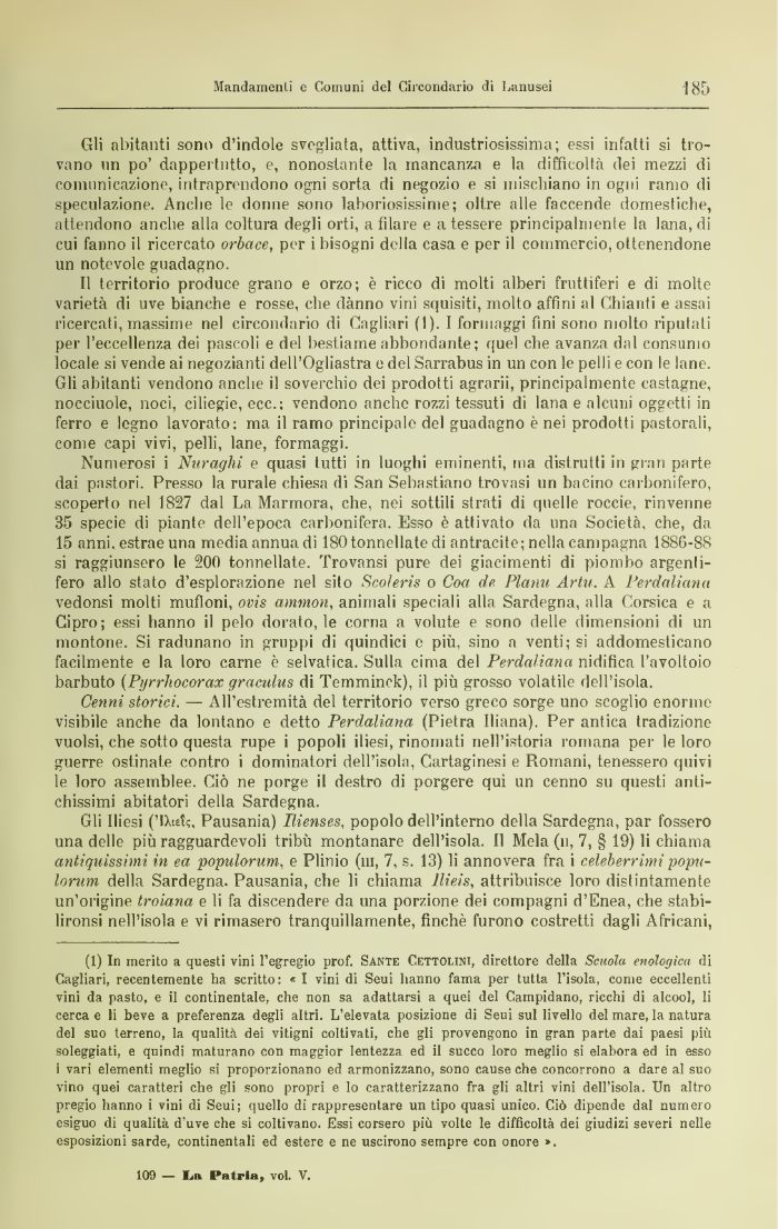 (1) In merito a questi vini l'egregio prof. SANTE Chttolini, direttore della Scuola enologica di Cagliari, recentemente ha scritto: « I vini di Seui hanno fama per tutta l'isola, come eccellenti vini da pasto, e il continentale, che non sa adattarsi a quei del Campidano, ricchi di alcool, li cerca e li beve a preferenza degli altri. L'elevata posizione di Seui sul livello del mare, la natura del suo terreno, la qualità dei vitigni coltivati, che gli provengono in gran parte dai paesi più soleggiati, e quindi maturano con maggior lentezza ed il succo loro meglio si elabora ed in esso i vari elementi meglio si proporzionano ed armonizzano, sono cause che concorrono a dare al suo vino quei caratteri che gli sono propri e lo caratterizzano fra gli altri vini dell'isola. Un altro pregio hanno i vini di Seui; quello di rappresentare un tipo quasi unico. Ciò dipende dal numero esiguo di qualità d'uve che si coltivano. Essi corsero più volte le difficoltà dei giudizi severi nelle esposizioni sarde, continentali ed estere e ne uscirono sempre con onore ».