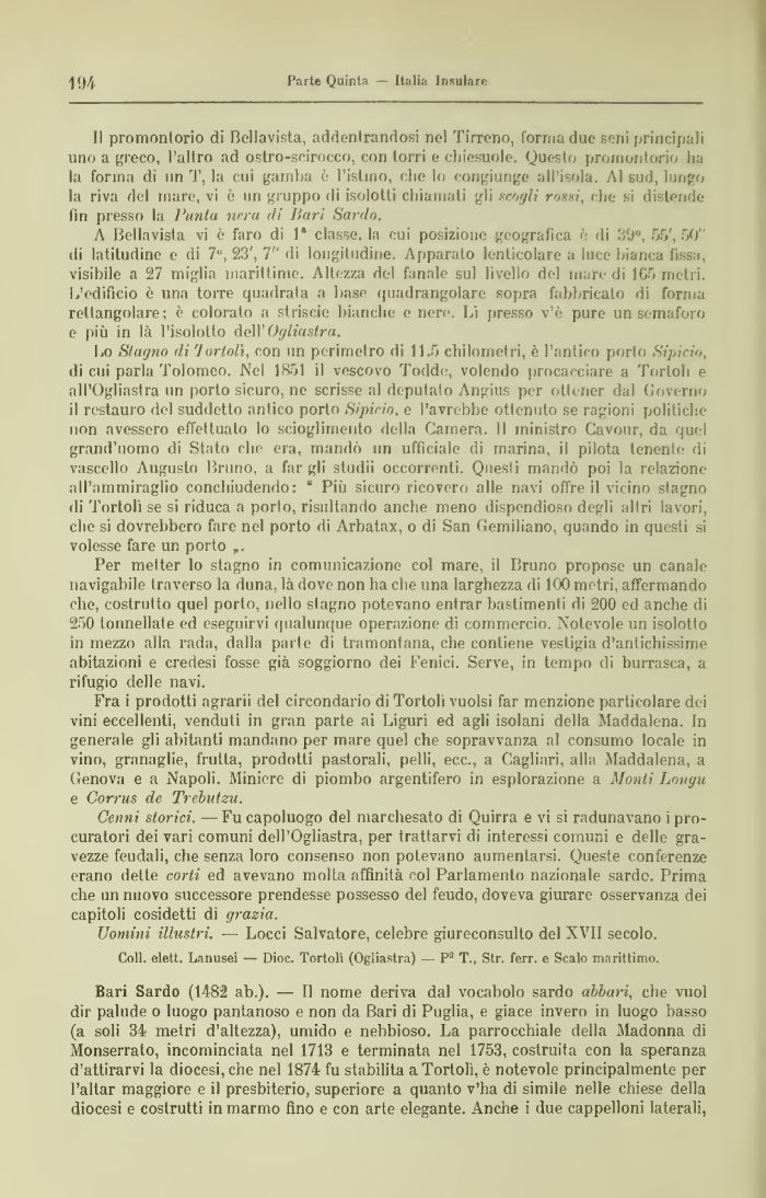 Bari Sardo (1482 ab.). — Il nome deriva dal vocabolo sardo abiuri, che vuol dir palude o luogo pantanoso e non da Bari di Puglia, e giace invero in luogo basso (a soli 34 metri d'altezza), umido e nebbioso. La parrocchiale della Madonna di Monserrato, incominciata nel 1713 e terminata nel 1753, costruita con la speranza d'attirarvi la diocesi, che nel 1874 fu stabilita a Tortoli, è notevole principalmente per l'aitar maggiore e il presbiterio, superiore a quanto v'ha di simile nelle chiese della diocesi e costrutti in marmo fino e con arte elegante. Anche i due cappelloni laterali,