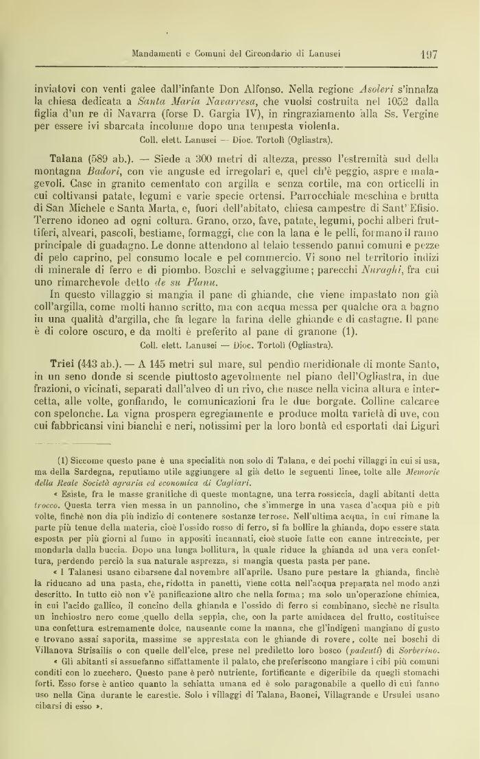 (1) Siccome questo pane è una specialità non solo di Talana, e dei pochi villaggi in cui si usa, ma della Sardegna, reputiamo utile aggiungere al già detto le seguenti linee, tolte alle Memorie della Reale Società agraria ed economica di Cagliari.