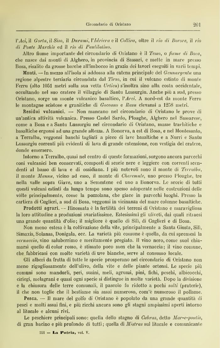 Residui vulcanici. — Non mancano nel circondario di Oristano le prove di un'antica attività vulcanica. Presso Castel Sardo, Ploaghe, Alghero nel Sassarese, come a Bosa e a Santu Lussurgiu nel circondario di Oristano, masse tradii!iche e basaltiche ergonsi ad una grande altezza. A Bonoi va, a est di Bosa, e nel Montesanto, a TerraIba, veggonsi banchi tagliati a picco di lave basaltiche e a Nurri e Santu Lussurgiu correnti più evidenti di lava di grande estensione, con vestigia del cratere, donde emersero.