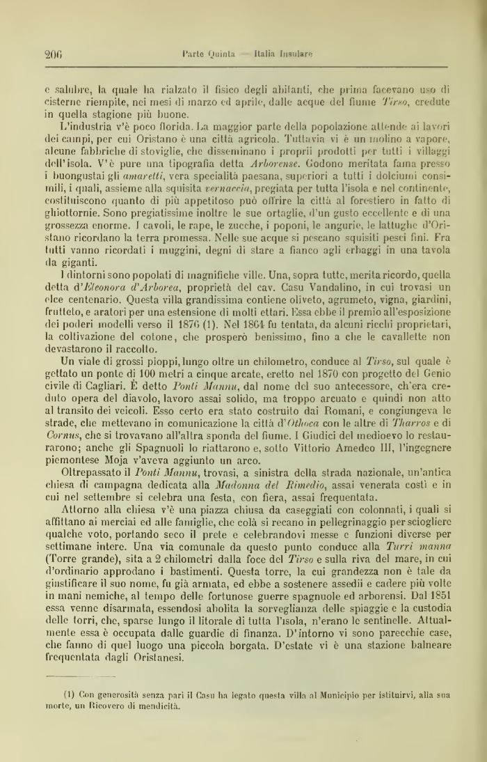 1 dintorni sono popolati di magnifiche ville. Una, sopra tutte, merita ricordo, quella detta d'Eleonora d'Arborea, proprietà del cav. Casu Vandalino, in cui trovasi un elee centenario. Questa villa grandissima contiene oliveto, agrumeto, vigna, giardini, frutteto, e aratori per una estensione di molti ettari. Essa ebbe il premio all'esposizione dei poderi modelli verso il 187G (1). Nel 18G4 fu tentata, da alcuni ricchi proprietari, la coltivazione del cotone, che prosperò benissimo, fino a che le cavallette non devastarono il raccolto.