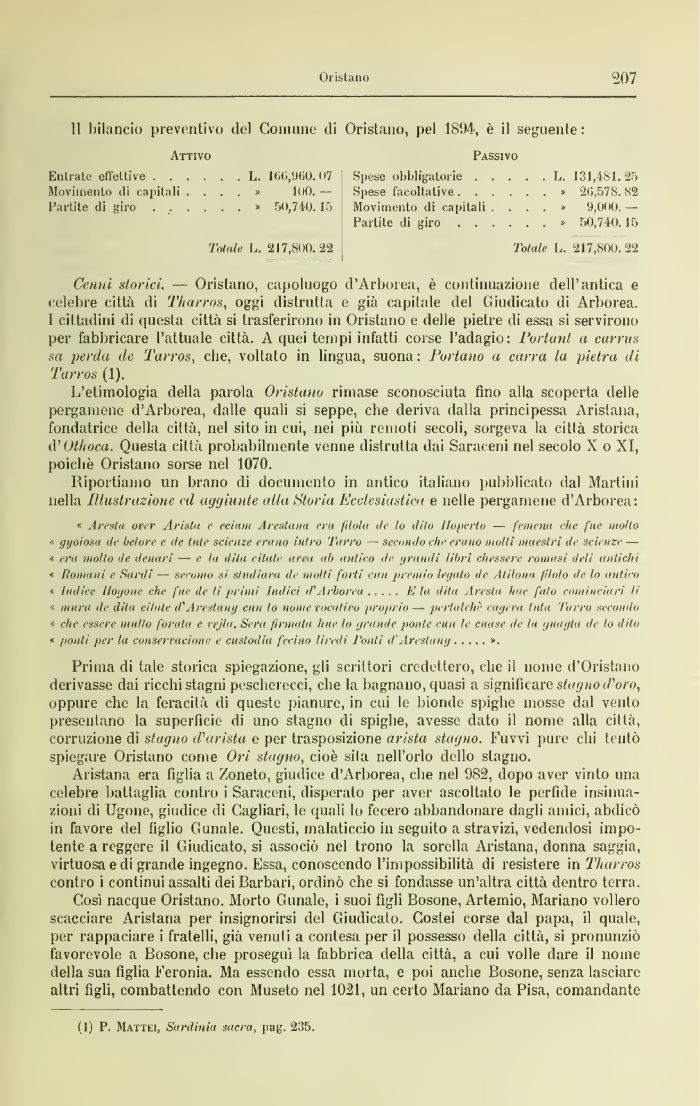 Centii storici. — Oristano, capoluogo d'Arborea, è continuazione dell'antica e celebre città di Tharros, oggi distrutta e già capitale del Giudicato di Arborea. I cittadini di questa citta si trasferirono in Oristano e delle pietre di essa si servirono per fabbricare l'attuale città. A quei tempi infatti corse l'adagio: Portoni a currus sa perda de Tarros, che, voltato in lingua, suona: Portano a carra la pietra di Tarros (1).