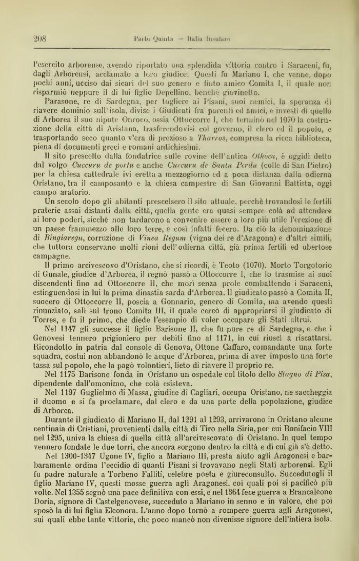 Parasone, re di Sardegna, per togliere ai Pisani, suoi nemici, la speranza di riavere dominio sull'isola, divise i Giudicati fra parenti ed amici, e investi di quello di Arborea il suo nipote Orn oco, ossia Ottoccorre I, che terminò nel 1070 la costruzione della città di A ristana, trasferendo visi col governo, il clero ed il popolo, e trasportando seco quanto v'era di prezioso a Titarros, compresa la ricca biblioteca, piena di documenti greci e romani antichissimi.