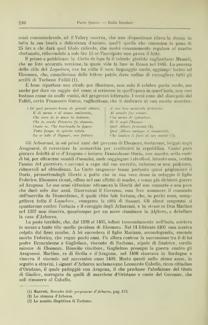 Il primo a pubblicare la Carta de toga fu il valente giurista cagliaritano Mameli, che ire fece accurata versione, la quale vide la luce ira Boma nel 1805. La purezza dello stile del Logudoro, ove ha culla il vero linguaggio sardo, aggiungi- lustro ad Eleonora, che, amantissima delle lettere patr ie, dava ordine di raccogliere tutti gli scritti di Torbeno Fallili (1).
