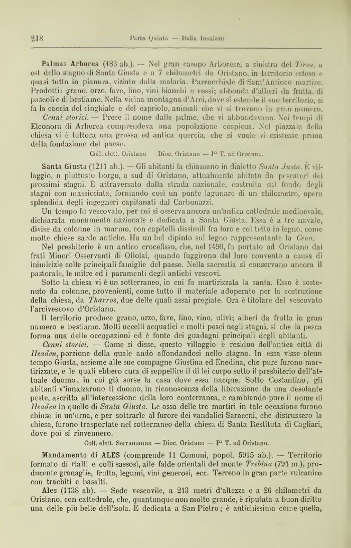 Palmas Arborea (183 ab.)- — Nel gran campo Arbore.se, a sinistra del 7imo, a est dello stagno di Sartia. Gi usta e a 7 chilometri da Oristano, in territorio esteso e quasi tutto in pianura, vizialo dalla malaria. Parrocchiale di Sant'Antioco martire. Prodotti: grano, orzo, fave, lino, vini bianchi e rossi ; abbonda d'alberi da frutla, di pascoli e di bestiame. Nella vicina montagna d'Arci, dove si estende il suo territorio, si fa la caccia del cinghiale e del capriolo, animali t;he vi si trovano in gran num