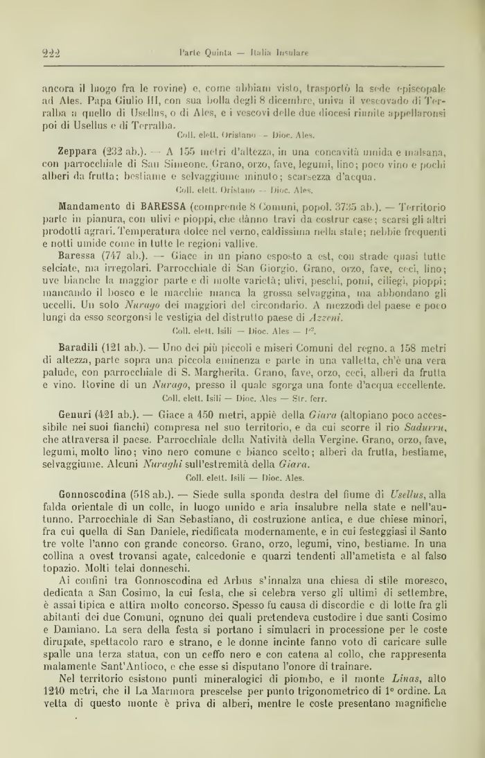 Baressa (747 ab.). — Giace iri un piano esposto a est, con strade quasi tutte selciate, ma irregolari. Parrocchiale di San Giorgio. Grano, orzo, fave, erci, lino; uve bianche la maggior parte e di molte varietà; ulivi, peschi, pomi, ciliegi, pioppi; mancando il bosco e le macchie manca la grossa selvaggina, ma abbondano gli uccelli. Òli solo Nurago dei maggiori del circondario. A mezzodì del paese e poco lungi da esso scorgonsi le vestigia del distrutto paese di Azzini.