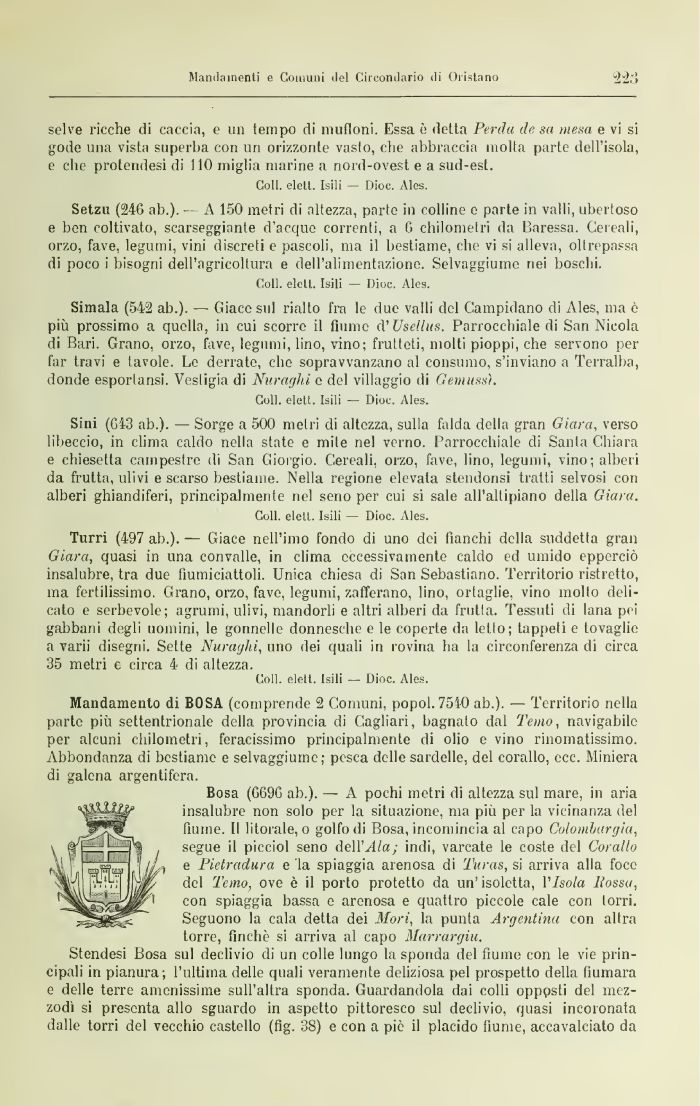 Stendesi Bosa sul declivio di un colle lungo la sponda del fiume con le vie principali in pianura; l'ultima delle quali veramente deliziosa pel prospetto della fiumara e delle terre amenissime sull'altra sponda. Guardandola dai colli opposti del mezzodì si presenta allo sguardo in aspetto pittoresco sul declivio, quasi incoronata dalle torri del vecchio castello (fig. 38) e con a piò il placido fiume, accavalciato da