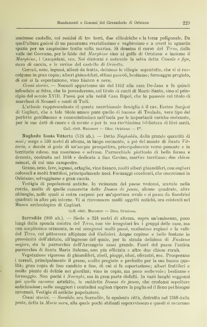 Sorradile (980 ab.). — Siede a 324 metri di altezza, sopra un'eminenza, poco lungi dalla sponda sinistra del 1 irso, con vie iiregolari fra i gruppi delle case, ma con amplissimo orizzonte, in cui scorgonsi molti paesi, vastissime regioni e la valle del Tirso, col pittoresco altipiano del tìuilcieri. Acque copiose e belle fontane in prossimità dell'abitato, all'ingresso del quale, per la strada deliziosa di Funtana major e, sta la parrocchia dell'Arcangelo assai grande. Fuori del paese l'antica parrocchia di Santa Maria Salome, non più officiata e altre due chiese rurali.