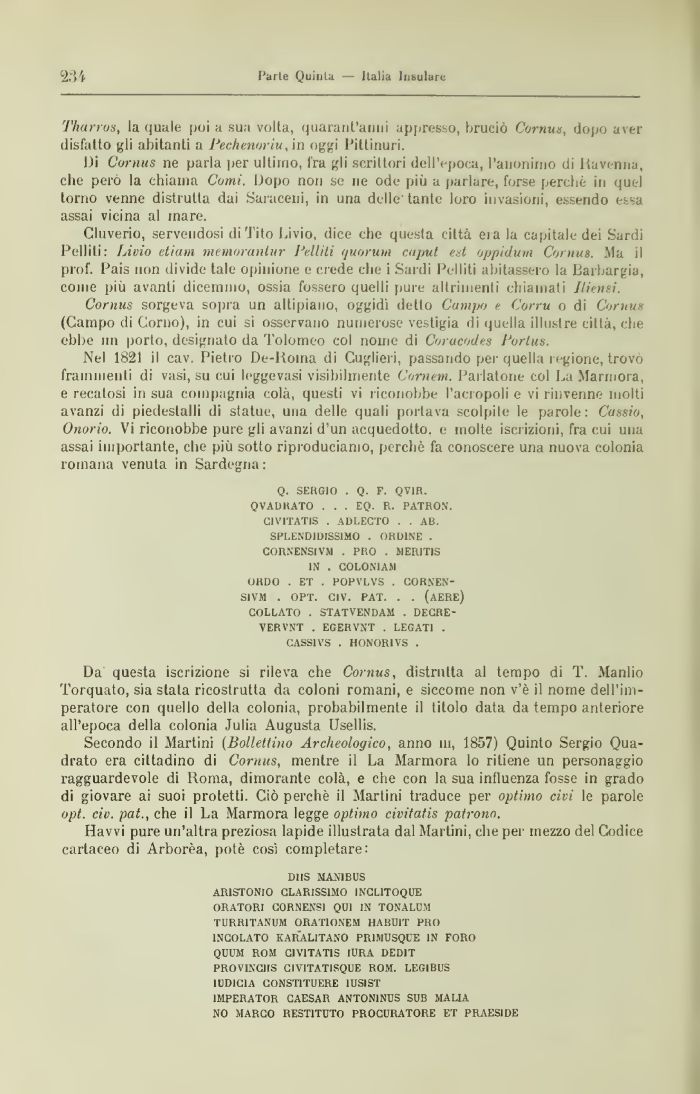 Secondo ;1 Martini (Bollettino Archeologico, anno m, 1857) Quinto Sergio Quadrato era cittadino di Coruus, mentre il La Marmora lo ritiene un personaggio ragguardevole di Roma, dimorante colà, e che con la sua influenza fosse in grado di giovare ai suoi proletti. Ciò perchè il Martini traduce per opiimo civi le parole opt. civ. pai., che il La Marmora legge opiimo civitatis patrono,