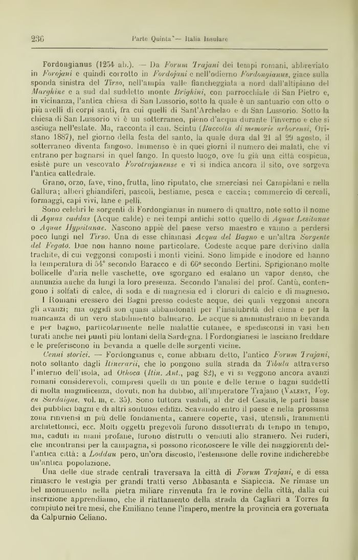 Fordougianus (1254 ah.). Da Forum 'lrujuni dei tempi romani, abbreviato in Forojani e quindi corrotto in Fordojuni c nell'odierno Fordongianus, giace Bulla sponda sinistra del Tirso, nell'ampia valle fiancheggiata a nord dall'altipiano del Mtmjhine e a sud dal suddetto monte Jirighini, con parrocchiale di San Pietro e, m vicinanza, l'antica chiesa di San Lussorio, sotto la quale è un santuario con otto o più avelli di corpi santi, fra cui quelli di Sant'Archelao e di San Lussorio. Sotto la chiesa di San Lussorio vi è un sotterraneo, pieno d'acqua durante l'inverno e che si asciuga nell'estate. Ma, racconta il can. Scintu (J,'accolta di memorie, arborensi, Oristano 1887), nel giorno della festa del santo, la quale dura dal 21 al 2'J agosto, il sotterraneo diventa fangoso. Immenso è in quei giorni il numero dei malati, che vi entrano per bagnarsi in quel fango. In questo luogo, ove fu già una città cospicua, esistè pure 1111 vescovato Forotrajanense e vi si indica ancora il sito, ove sorgeva l'antica cattedrale.