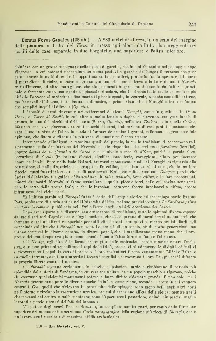 Ma l'ultima parola sui Nuraghi fu teste detta dall'egregio storico ed archeologo sardo Ettore Pais, professore di storia antica nell'Università di Pisa, nel suo pregiato volume La Sardegna prima del dominio romeno, pubblicato nel 1892 a Roma negli Atti. dell'Accademia dei Lincei.