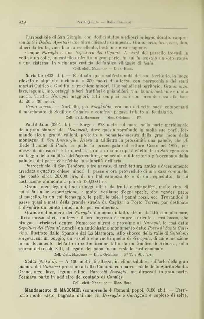 Norbello (833 ab.). — È situato quasi sull'estremità del suo territorio, in luogo rilevato e alquanto inclinato, a 350 metri di altezza, con parrocchiale dei santi martiri Quirico e Giulitta, e tre chiese minori. Due paludi nel territorio. Grano, orzo, fave, legnini, lino, ortaggi, alberi fruttiferi e ghiandiferi, vini buoni, bestiame e molta caccia. Tredici Nuraghi maggiori, tutti semplici coni con circonferenza alla base da 20 a 30 metri.