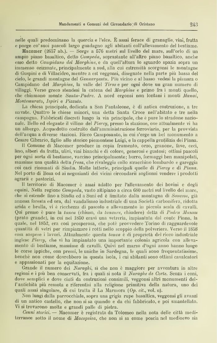 Macomer (2657 ab.). — Sorge a 576 metri sul livello del mare, sull'orlo di un ampio piano basaltico, detto Campeda, soprastante all'altro piano basaltico, anche esso detto Campidano del Marghine, e da quell'altura lo sguardo spazia sopra un immenso orizzonte, principalmente a sud, alla cui estremità scorgonsi le montagne di Guspini e di Villacidro, mentre a est veggonsi, disegnate nella parte più bassa del cielo, le grandi montagne del Gennargentu. Più vicino e al basso vedesi la pianura o Campidano del Marghine, la valle del Tirso e per ogni dove un gran numero di villaggi. Verso greco stendesi la catena del Marghine e primo fra i monti quello, che chiamano monte tìantu-Padre. A nord ergonsi non lontani i monti Manai, Montemurato, Ispiri e Pizzuto.